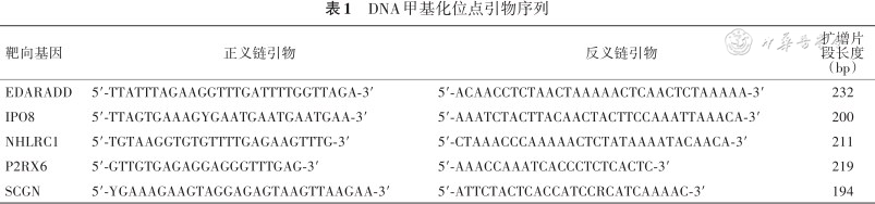 2.方法:(1)问卷调查:采用自制问卷对广西壮族自治区长寿队列对象进行面对面调查,收集对象人口学特征(性别和年龄)、家族疾病史(包括慢性支气管炎、高血压、高血脂、糖尿病、心脑血管疾病、肿瘤、痴呆和关节病变)等资料;(2)体格检查:对广西壮族自治区长寿队列对象测量身高、体重、心率和血压等指标;(3)医疗档案资料收集:由医院信息系统导出解放军总医院第七医学中心体检对象的人口学和体格检查资料;(4)血液生化检测:对所有对象均以抗凝管和促凝管各采集5 ml空腹外周静脉血,采用ADVIA2400型全自动生化分析仪(德国西门子公司)检测空腹血糖(FBG)、高密度脂蛋白胆固醇(HDL-C)、低密度脂蛋白胆固醇(LDL-C)、总胆固醇(TC)和甘油三酯(TG)等指标;(5)甲基化位点测定:对Levine等[12](513个CpG位点)、Horvath[13](353个CpG位点)和Hannum等[14](70个CpG位点)报道的位点进行重叠交集分析,获得的5个CpG位点,采用Genomic Tip-500试剂盒(北京天根生化科技有限公司)提取全血基因组DNA,采用EpiTect快速亚硫酸氢盐转化试剂盒(德国Qiagen公司)对DNA样本进行重亚硫酸盐处理,采用热启动Taq酶试剂盒(日本Takara公司)对5个CpG位点片段进行聚合酶链式扩增并构建文库,所需引物以Methylation Primer软件设计,由上海生工有限公司合成,引物序列见表1。由上海天昊生物科技有限公司采用MiSeq Benchtop测序仪(美国Illumina公司)对扩增产物进行双端测序并测定各CpG位点甲基化水平;(6)外周血白细胞端粒长度测定:采用DL50端粒相对长度检测试剂盒(上海翼和生物有限公司)以端粒重复拷贝数与单拷贝基因比率法计算端粒长度[15, 16];(7)年龄差值:年龄差值=公历年龄-生物学年龄。
