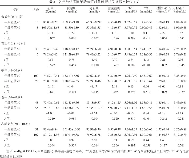注:1 mmHg=0.133 kPa,年龄差值=公历年龄-生物学年龄。TC为总胆固醇;TG为甘油三酯;HDL-C为高密度脂蛋白胆固醇;LDL-C为低密度脂蛋白胆固醇