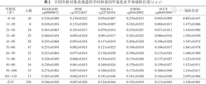| 年龄组(岁) | 人数 | EDARADD cg09809672 | IPO8 cg19722847 | NHLRC1 cg22736354 | P2RX6 cg05442902 | SCGN cg06493994 | 端粒长度 |