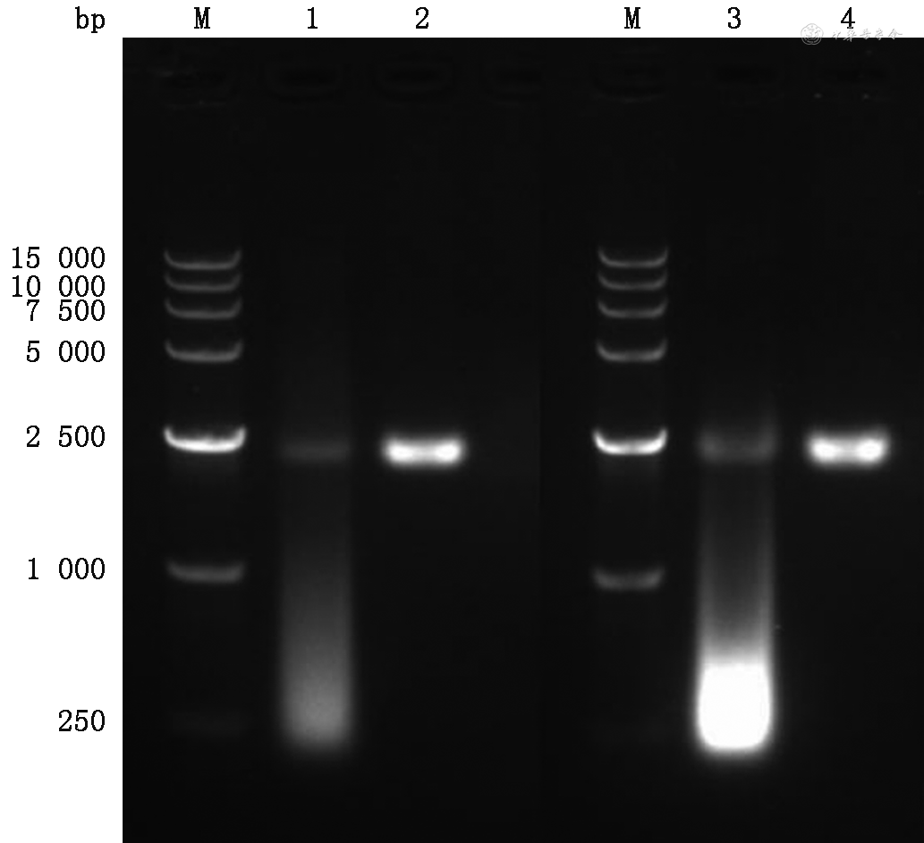 注:M为15 000 bp标准带;1为德尔塔变异株双酶消化前噬菌体毒样颗粒(VLP);2为德尔塔变异株双酶消化后VLP;3为非变异株双酶消化前VLP;4为非变异株双酶消化后VLP