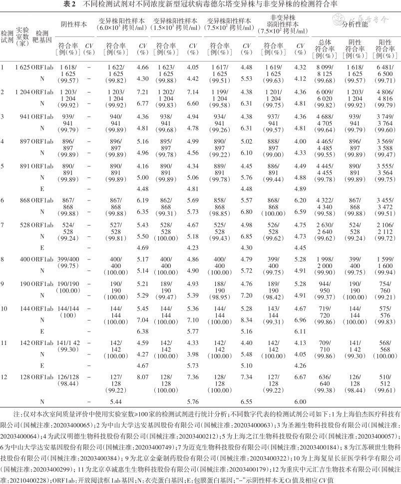 检测 试剂 | 实验 室数 (家) | 检测 靶基因 | 阴性样本 | 变异株阳性样本(6.0×103 拷贝/ml) | 变异株阳性样本 (1.5×103 拷贝/ml) | 变异株阳性样本 (7.5×102 拷贝/ml) | 非变异株 弱阳性样本 (7.5×102 拷贝/ml) | 分析性能 | ||||||||
