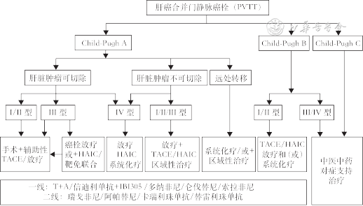 4. 系统治疗:(1)抗病毒治疗:HBV持续感染是乙肝相关肝癌发生发展、复发的重要危险因素,更是肝癌患者死亡的危险因素。抗病毒治疗有助于减少术后复发及改善肝癌患者生存[58]。PVTT虽已是肝癌发展的中晚期阶段,抗病毒治疗仍不容忽视。如何选用药物及时机已在《HBV/HCV相关性肝细胞癌抗病毒治疗专家共识》[59]中有详细论述。