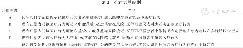 指南中的推荐意见共分5个级别,分别基于6个证据等级[10, 11],见表1、2。