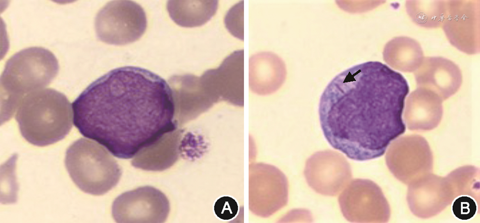 3. DIA系统原始细胞形态学计数验证:35份触发原始细胞报警的样本血涂片进行DIA预分类、再分类及人工分类,以人工分类结果为金标准,预分类、再分类均与人工分类结果具有相关性(r=0.812、0.983,均P<0.01)。其中,31份样本再分类与人工分类均见到不同比例原始细胞;1份样本经人工分类浏览全片发现2个原始细胞,DIA系统增加采集细胞数量后进行再分类,发现1个原始细胞;3份样本经DIA再分类及人工分类均未发现原始细胞。DIA采集的原始细胞形态及内部结构清晰,在人工审核时易于辨认(图1)。