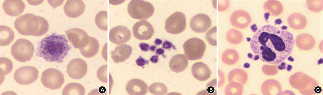 4. DIA系统PLT形态学计数验证:DIA系统PLT形态学计数与血细胞分析仪计数结果具有相关性(r=0.946,P<0.05);两种计数方法绝对值偏差百分比为13.14%(95%CI:11.56%~14.73%)。在29份血细胞分析仪PLT聚集报警样本中,有23份样本经DIA系统与人工镜检均见到不同程度PLT聚集,两种方法PLT计数绝对值偏差百分比为30.92%(95%CI:22.09%~42.18%);3份样本人工镜检见到PLT聚集,DIA未见显示,两种方法绝对值偏差百分比分别为33.51%、21.36%、36.78%;另外3份样本经两种方法检测,均未见PLT聚集,绝对值偏差百分比分别为13.16%、12.18%、11.96%。在22份巨PLT报警样本中,19份样本经DIA和人工镜检均见到巨PLT,两种方法绝对值偏差百分比为25.36%(95%CI:15.35%~37.75%);1份样本人工镜检见到巨PLT,DIA未见显示,绝对值偏差百分比为19.76%;另外2份样本经DIA和人工镜检均未见巨PLT,绝对值偏差百分比分别为13.25%、11.61%。DIA系统显示巨PLT、PLT聚集和PLT卫星现象见图2。