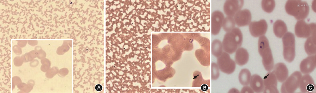 5. DIA系统疟原虫形态学检查验证:经DIA系统采集图像的18份疟原虫阳性外周血薄血涂片样本,由经验丰富的检验医师进行图像观察,其中17份检出疟原虫滋养体,且图像清晰;另外1份样本未见疟原虫。18份疟原虫阳性外周血薄血涂片样本直接进行人工镜检,均检出疟原虫滋养体(图3)。