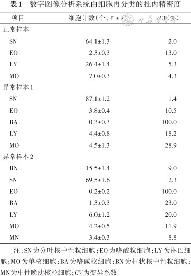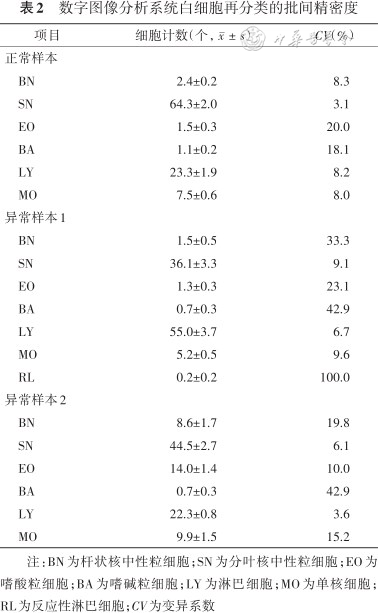 1. DIA系统的重复性评价:正常样本中杆状核中性粒细胞(BN)、分叶核中性粒细胞(SN)、淋巴细胞(LY)、单核细胞(MO)的CV值均<10%;正常样本嗜酸粒细胞(EO)、嗜碱粒细胞(BA)和异常样本全部WBC随百分比减低,CV值增大。DIA系统的批内精密度及批间精密度结果见表1、2。