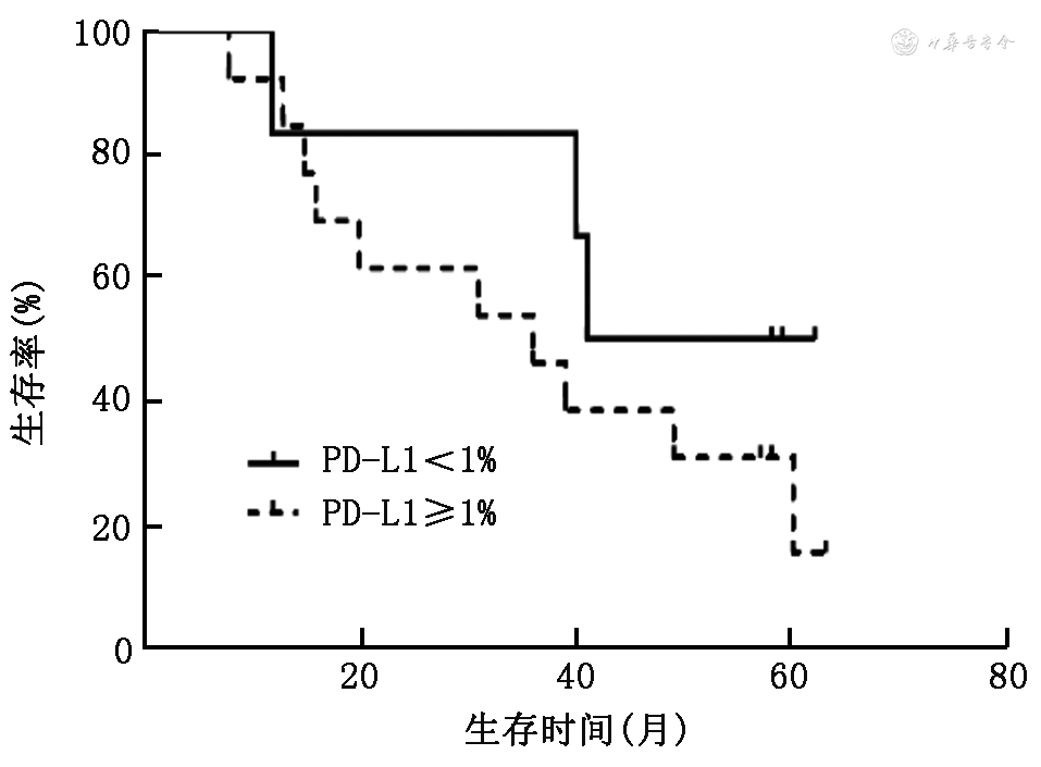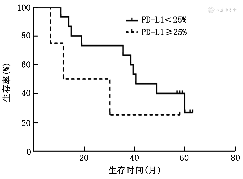 6. PD-L1的表达与NSCLC患者生存的关系:PD-L1表达<1%组和PD-L1表达≥1%组NSCLC患者的中位OS分别为40个月(95%CI未达终点)和35个月(95%CI:12.7~57.3个月),差异无统计学意义(χ²=1.15,P=0.284;图2)。PD-L1表达<25%组和PD-L1表达≥25%组患者的中位OS分别为40个月(95%CI:27.4~52.6个月)和12个月(95%CI:0.0~34.5个月),差异亦无统计学意义(χ²=1.38,P=0.241;图3)。