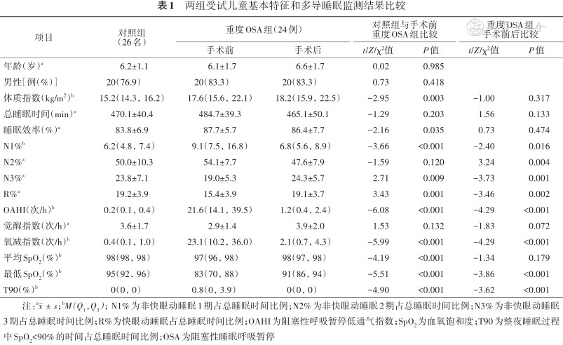 两组受试儿童基本特征和多导睡眠监测结果比较