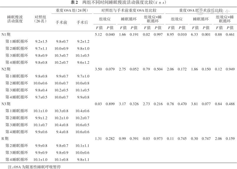 睡眠慢波 活动强度 | 对照组(26名) | 重度OSA组(24例) | 对照组与手术前重度OSA组比较 | 重度OSA组手术前后比较 | |||||