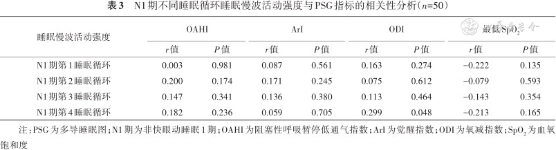 4. N1期SWA强度与PSG指标的相关性分析:N1期第4睡眠循环SWA强度与ODI呈正相关(P=0.048),与OAHI、ArI和最低SpO2均无相关性。N1期第1、第2和第3睡眠循环SWA强度与PSG指标均无相关性(均P>0.05)(表3)。