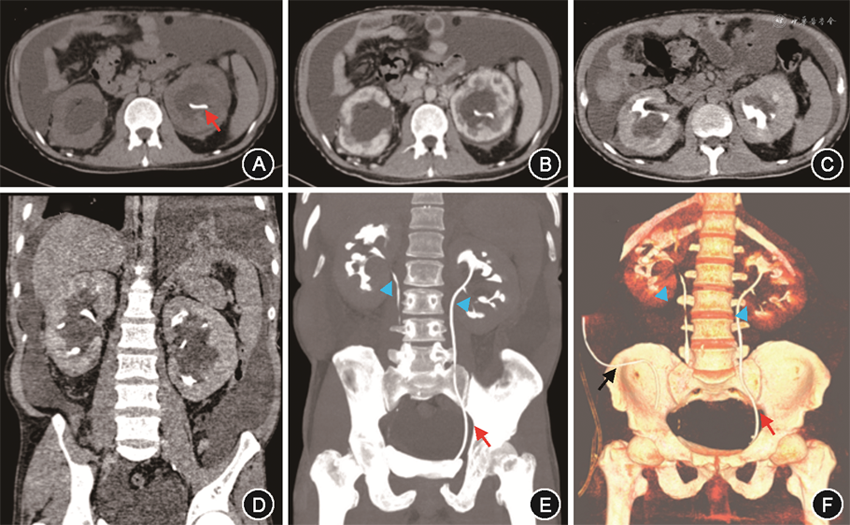 注:红色箭头示左侧D-J管;蓝色三角示肾盂受压狭窄处;黑色箭头示腹腔引流管