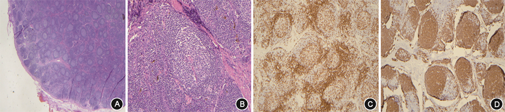 入院后实验室检查:Hb 134 g/L,白细胞(WBC)11.42×109/L,血小板528×109/L。血生化:Alb 29 g/L,丙氨酸转氨酶 106 U/L,天冬氨酸转氨酶 60 U/L,碱性磷酸酶677 U/L,谷氨酰胺转移酶 334 U/L,总胆红素12.4 μmol/L,磷1.8 mmol/L,钙2.24 mmol/L,SCr 138 μmol/L。超敏C反应蛋白(hsCRP)>250 mg/L,红细胞沉降率(ESR)86 mm/1h,白细胞介素(IL)-6 104.0 ng/L,IL-8 68.0 ng/L,肿瘤坏死因子(TNF)-α 17.3 ng/L,血管内皮生长因子(VEGF)270.0 ng/L。外周血抗PLA2R:阴性。血清蛋白电泳、免疫固定电泳、自身免疫性疾病及感染指标均阴性。24 h尿蛋白0.4 g。腹水常规:WBC 92×106/L,单核细胞 73×106/L,黎氏试验(-)。腹水生化:总蛋白 5 g/L,Alb 4 g/L(同期血清Alb 30 g/L),腺苷脱氢酶 0.6 U/L,乳酸脱氢酶 44 U/L,葡萄糖 5.0 mmol/L。病原学、肿瘤标志物、肿瘤细胞:阴性。超声:双侧锁骨上窝及颈部多发肿大淋巴结,皮髓质分布不清,较大者位于右侧锁骨上窝(1.9 cm×1.3 cm)。泌尿系超声:双肾盂无回声,内见分隔,符合肾盂周囊肿。心脏超声:未见明显异常。CT尿路造影:双肾盂周围低密度灶,肾盂周囊肿可能;双肾体积增大,密度、强化不均,双肾周可见积液包绕;左侧D-J管置入术后;多浆膜腔积液;门静脉系统未见血栓(图1)。淋巴显像:肾实质弥漫性淋巴管扩张;双下肢内侧集合淋巴管、左静脉角淋巴管扩张可能;双肾盂囊肿占位,肾周低密度影,腹腔见大量积液。尿乳糜试验、腹水乳糜试验均阴性。肾脏穿刺病理本院会诊:符合膜性肾病,合并肾小管间质病变。病理结果:(右侧锁骨上淋巴结)符合Castleman病(透明血管型)(图2)。因患者尿蛋白量少,提示膜性肾病非复发状态,膜性肾病无法解释患者反复肾周出血、双肾盂周囊肿,且患者合并大量腹水,行肾脏穿刺难度大、出血风险高,故未行重复肾活检。治疗方面予间断引流腹水(共计约12 000 ml)、补充白蛋白、呋塞米+螺内酯联合利尿,胸闷、憋气、干咳症状好转,拔除引流管,体重稳定于55 kg左右,腹围82 cm,脉搏70~80 次/min,不吸氧状态下动脉血氧饱和度96 %。复查hsCRP 5.7 mg/L,IL-6 15.4 ng/L,IL-8 16.0 ng/L,IL-10 5.0 ng/L,TNF-α 15.9 ng/L,血清Alb 36 g/L,SCr 101 μmol/L,胸腹盆CT示胸水及腹水明显减少。经内科大查房(消化科、肾内科、血液科、放射科、核医学科、病理科)讨论,考虑特发性多中心Castleman病(iMCD)诊断明确,目前已无疾病活动证据,建议随诊观察,若再出现疾病活动表现,可针对iMCD治疗;患者膜性肾病病情稳定,监测血清Alb、SCr好转,且患者对肾脏穿刺并发症顾虑较大,遂未重复肾活检,建议定期监测肾功能、24 h尿蛋白。因iMCD难以解释反复肾周出血,需警惕肾盂周囊肿导致肾静脉压力升高继发出血可能,建议规律利尿、定期监测泌尿系影像学。出院随访至2021年10月29日,病情稳定。
