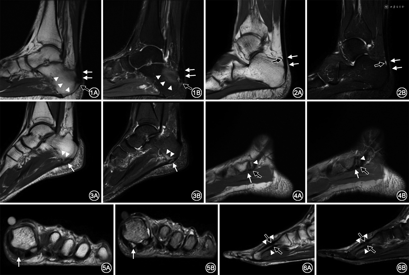 3.图像分析:由2名从事骨骼肌肉影像诊断的高级职称医师(分别工作8、10年)观察、分析和记录MRI表现,分别对足部韧带、肌腱、骨及软组织病变进行诊断,二者意见不一致时,引入第3名高级医师(工作年数15年)进行协商,取得一致性诊断意见。