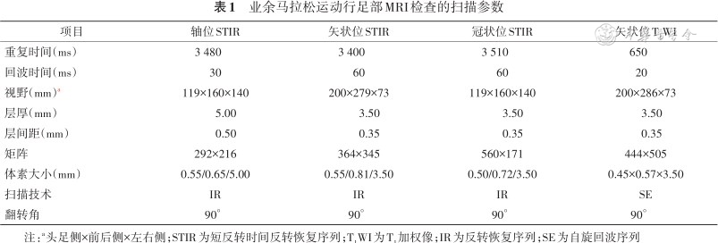 业余半程马拉松运动作为一种简便易行、参与成本低的健身运动,在全球范围内广受欢迎,参与人数逐渐增高。业余半程马拉松运动能够有效提高参与者的耐力,降低参与者的体重及心血管病发生的风险[1],但会增加业余半程马拉松运动员足部损伤的发生率[2]。本文通过统计并描述业余半程马拉松运动员足部损伤的MRI表现,旨在提高对足运动损伤的认识,并降低足部损伤的发病率,促进损伤的早日康复。