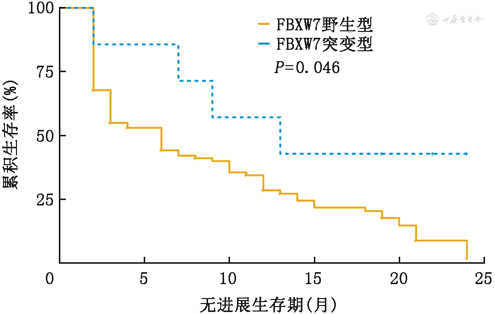 125例NSCLC患者中,FBXW7突变率为5.6%(7/125),7例FBXW7突变患者中,男6例,女1例,年龄63(52~72)岁;4例有吸烟史;4例为鳞癌,3例为腺癌;2例患者接受治疗前为ⅢB期,5例为Ⅳ期。7例患者的FBXW7突变类型均为截断突变,在接受免疫治疗后,部分缓解4例,疾病稳定2例,疾病进展1例,ORR为4/7,DCR为6/7。FBXW7突变患者中位PFS为13.0个月(95%CI:7.0~22.0个月),优于FBXW7野生型患者的4.0个月(95%CI:2.0~11.5个月)(P=0.046),见图1。FBXW7突变的NSCLC患者接受免疫治疗具有较高的中位PFS、DCR及ORR。基于此,初步认为FBXW7在预测NSCLC免疫治疗疗效方面有一定的应用价值。