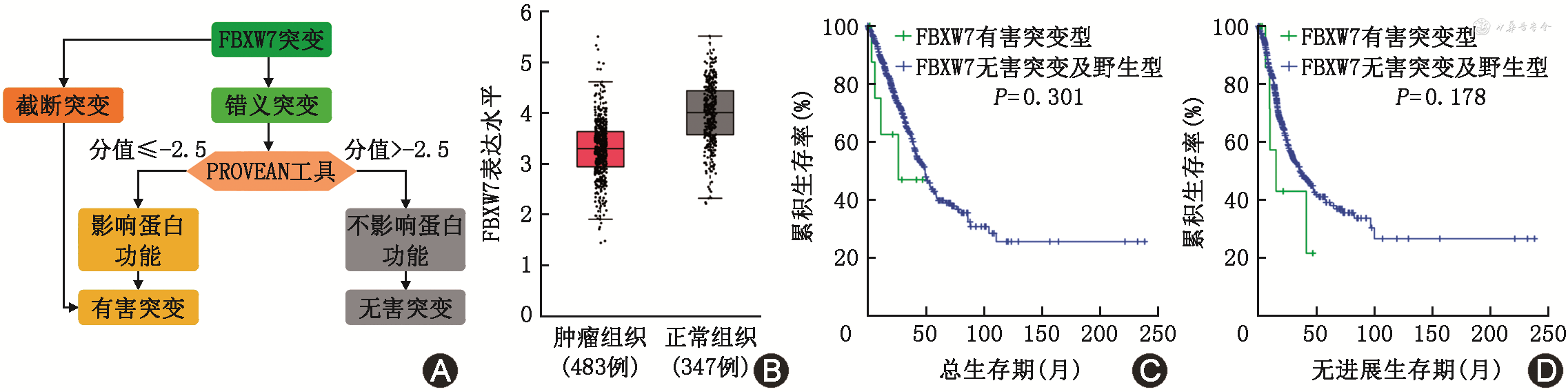 本研究发现,在真实世界队列和公共数据队列中,FBXW7突变主要为截断和错义突变。不同于截断突变通过基因表达缺失影响肿瘤细胞功能,错义突变是有害亦或是有益的,取决于它对蛋白质结构的影响。通过PROVEAN工具发现,免疫治疗队列中的FBXW7突变均为影响生物学功能的突变,工作流程见图3A。因此,接下来重点研究FBXW7有害突变与免疫治疗疗效的关系。对TCGA队列中所有FBXW7突变进行功能预测,最终将截断突变与影响蛋白功能的错义突变共同定义为del-FBXW7mut。采用GEPIA在线工具分析发现,FBXW7在肿瘤中的表达低于正常组织,提示FBXW7低表达可能促进肿瘤的发生,见图3B。TCGA队列的生存分析显示,del-FBXW7mut患者的总生存率、无进展生存率与FBXW7无害突变以及FBXW7野生型患者相比,差异均无统计学意义,见图3C、3D。说明del-FBXW7mut并不是肺癌的预后指标,更强调了其对于免疫治疗疗效的预测价值。