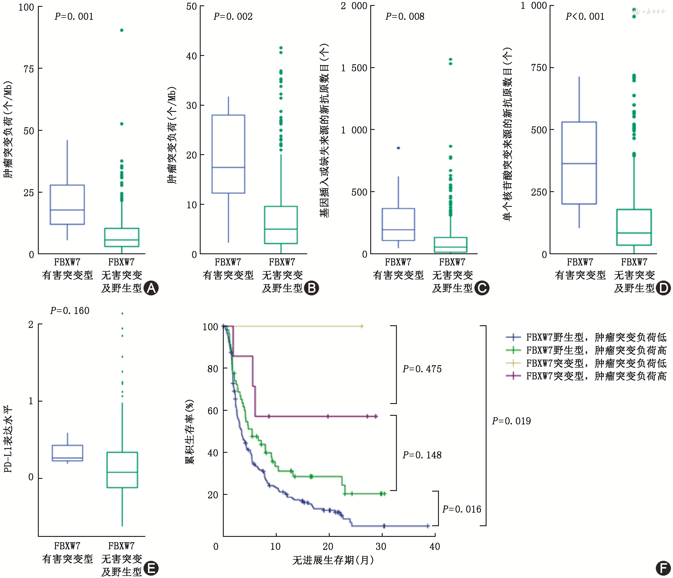 3. 癌症基因组图谱(the cancer genome atlas,TCGA)队列:为了进一步探索FBXW7突变与免疫激活的关系,在TCGA数据库下载NSCLC患者转录组和基因突变数据进行后续分析,称为TCGA队列,共1 030例患者,男633例,女397例,年龄67(60~73)岁。