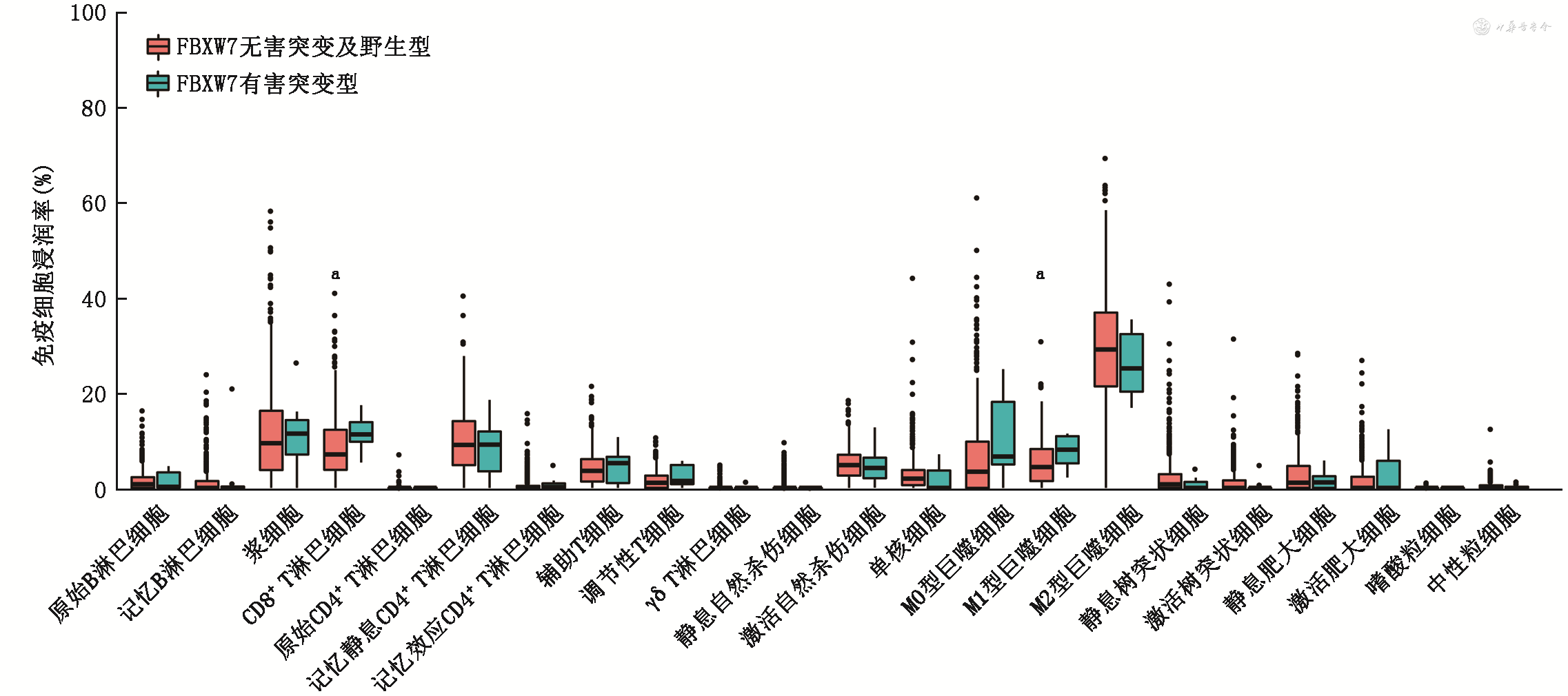 125例NSCLC患者中,FBXW7突变率为5.6%(7/125);7例患者的FBXW7突变类型均为截断突变,在接受免疫治疗后,部分缓解4例,疾病稳定2例,疾病进展 1例,客观缓解率(ORR)为4/7,疾病控制率(DCR)为6/7。FBXW7突变患者中位无进展生存期(PFS)为13.0个月(95%CI:7.0~22.0个月),优于FBXW7野生型患者的4.0个月(95%CI:2.0~11.5个月)(P=0.046)。生物信息学分析显示,FBXW7突变型患者接受免疫治疗后临床获益更高。免疫治疗队列中FBXW7突变型患者的肿瘤突变负荷[M(Q1,Q3)]为17.8(11.5,29.3)个/Mb,高于FBXW7野生型患者[5.7(3.0,10.4)个/Mb,P=0.001]。TCGA队列中,FBXW7突变型患者的肿瘤突变负荷为15.9(4.2,28.1)个/Mb,基因插入或缺失来源的肿瘤新抗原为192.5(70.8,535.0)个,单核苷酸突变来源的肿瘤新抗原为363.0(194.8,534.8)个,均高于FBXW7野生型患者的5.6(3.2,8.9)个/Mb、53.0(12.0,131.0)个、83.5(34.0,178.0)个(P=0.002、0.008、P<0.001),表明FBXW7突变型肿瘤具有更强的免疫原性,可能产生强大的抗肿瘤免疫。FBXW7突变与T淋巴细胞的激活有关,表现为T淋巴细胞受体复合物与信号传导的激活。进一步对肿瘤免疫细胞浸润程度分析发现,FBXW7突变型肿瘤的CD8+T淋巴细胞和M1型巨噬细胞浸润率分别为10%(8%,14%)、8%(4%,11%),均高于FBXW7野生型肿瘤的7%(4%,12%)、4%(1%,8%)(P=0.049、0.046)。