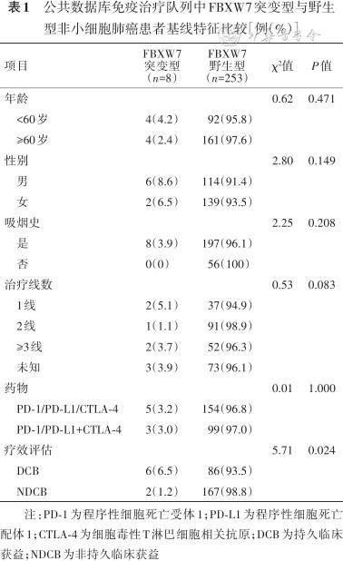 公共数据库免疫治疗队列中FBXW7突变型与野生型非小细胞肺癌患者基线特征比较[例(%)]