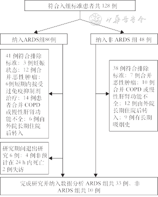 纳入符合入组标准的患者128例,其中ARDS的患者80例。ARDS患者中41例被排除,研究过程中有6例退出研究,最终共纳入研究ARDS患者33例,其中男18例,女15例,年龄(65.5±15.5)岁。非ARDS患者一共48例,其中38例被排除,最终纳入10例,其中男8例,女2例,年龄(57.2±15.3)岁,两组患者的年龄、性别、身高以及体重等基础资料差异无统计学意义,具有可比性(均P>0.05)。入组流程图见图1。