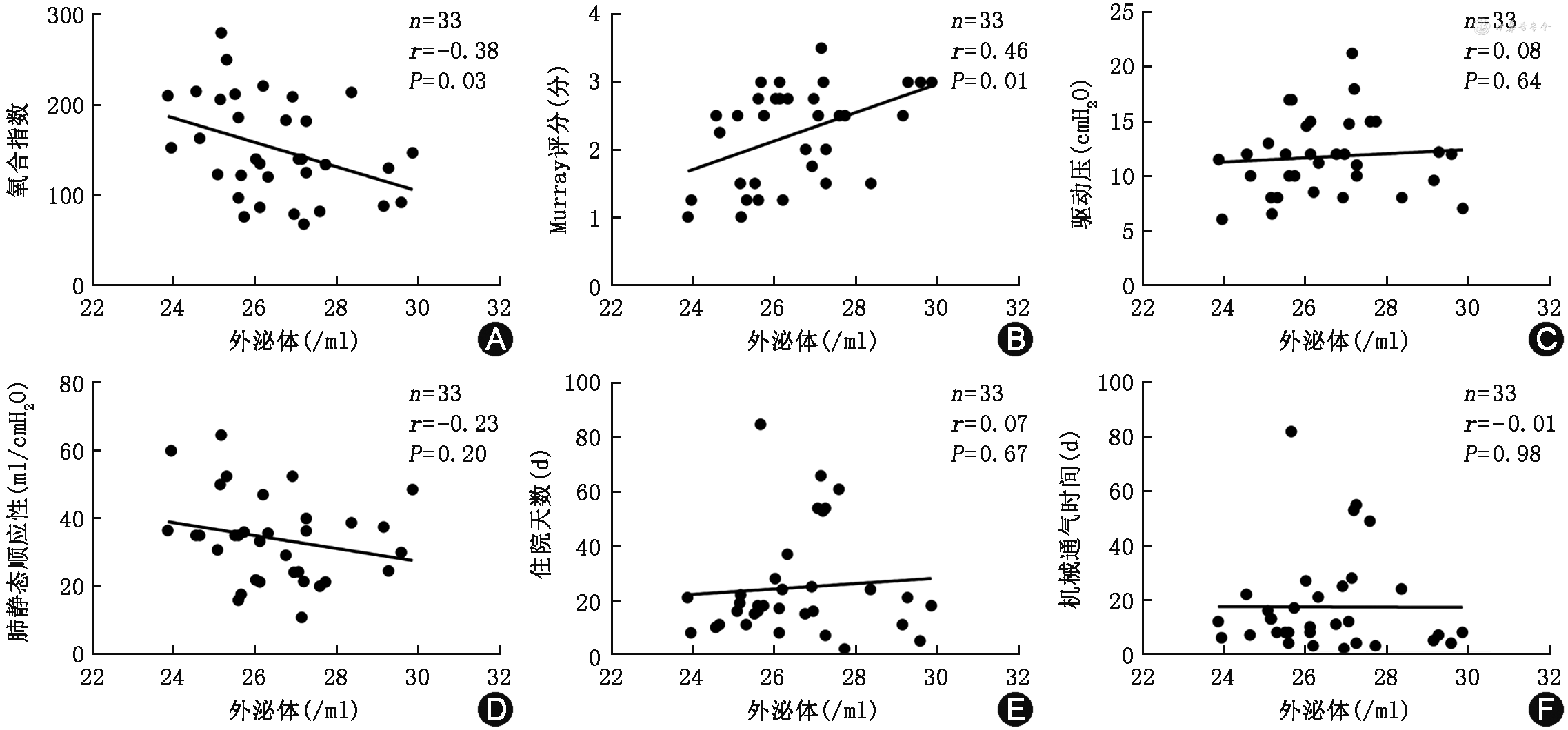 ARDS组与非ARDS组间性别、年龄差异均无统计学意义(均P>0.05)。ARDS组血浆中外泌体含量明显高于非ARDS组[(25.3±1.2)个/ml比(24.2±1.6)个/ml,P=0.031],而ARDS组BALF中外泌体含量同样高于非ARDS组[(26.5±1.6)个/ml比(24.6±1.1)个/ml,P=0.001]。肺内原因导致的ARDS患者BALF中外泌体含量高于肺外原因导致的ARDS组[(26.9±1.5)个/ml比(25.2±0.9)个/ml,P=0.01],而细菌性感染是其BALF中外泌体含量最高的亚组。轻度ARDS组比重度ARDS组BALF中的外泌体含量明显更低[(25.7±1.3)个/ml比(27.2±1.5)个/ml,P=0.038];ARDS患者BALF中外泌体的含量与P/F呈负相关性(r=-0.38,P=0.03);与Murray肺损伤评分水平呈正相关性(r=0.47,P=0.01);与驱动压水平、静态顺应性水平、住院时间、机械通气时间和28 d预后均无相关性(均P>0.05)。