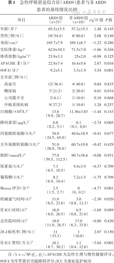 | 项目 | ARDS组 (n=33) | 非ARDS组 (n=10) | t/χ2/U值 | P值 |