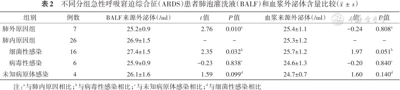 ARDS组BALF和血浆中的外泌体含量均明显高于非ARDS组[(26.5±1.3)个/ml比(24.6±1.1)个/ml、(25.3±1.2)个/ml比(24.3±1.6)个/ml,t=3.55、2.23,均P<0.05]。对ARDS组根据病因进行分类发现肺内原因组BALF中外泌体含量明显高于肺外原因组(P=0.01),而两组血浆中的外泌体含量差异无统计学意义(P>0.05)。对肺内原因导致ARDS组的患者亚组分析发现,细菌性感染导致ARDS患者BALF中外泌体水平高于病毒性感染导致的ARDS(P=0.03),而各亚组的血浆中外泌体含量差异无统计学意义(均P>0.05,表2)。