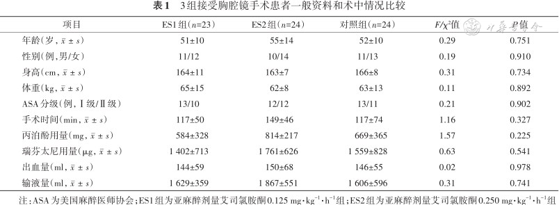 注:ASA为美国麻醉医师协会;ES1组为亚麻醉剂量艾司氯胺酮0.125 mg·kg-1·h-1组;ES2组为亚麻醉剂量艾司氯胺酮0.250 mg·kg-1·h-1组