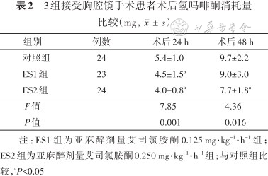 3组接受胸腔镜手术患者术后氢吗啡酮消耗量比较(mg,)