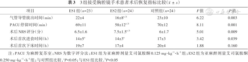 3组接受胸腔镜手术患者术后恢复指标比较()