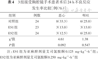 4. 术后24 h不良事件比较:3组患者手术均顺利完成,围手术期不良反应均予对症处理,未发生严重并发症。3组患者术后24 h不良反应发生率比较差异无统计学意义(P>0.05),结果见表4。