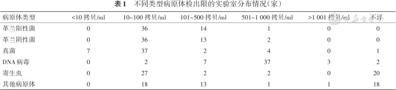 61家实验室做过mcfDNA测序流程的性能确认实验,其中51家曾测试过本实验室mNGS检测流程对各类病原体的检出限(表1)。各实验室自建mNGS检测流程对革兰阳性菌、革兰阴性菌、真菌、寄生虫及其他病原体的最低检出限主要分布在10~100 拷贝/ml,对DNA病毒的检出限主要分布在500~1 000 拷贝/ml。
