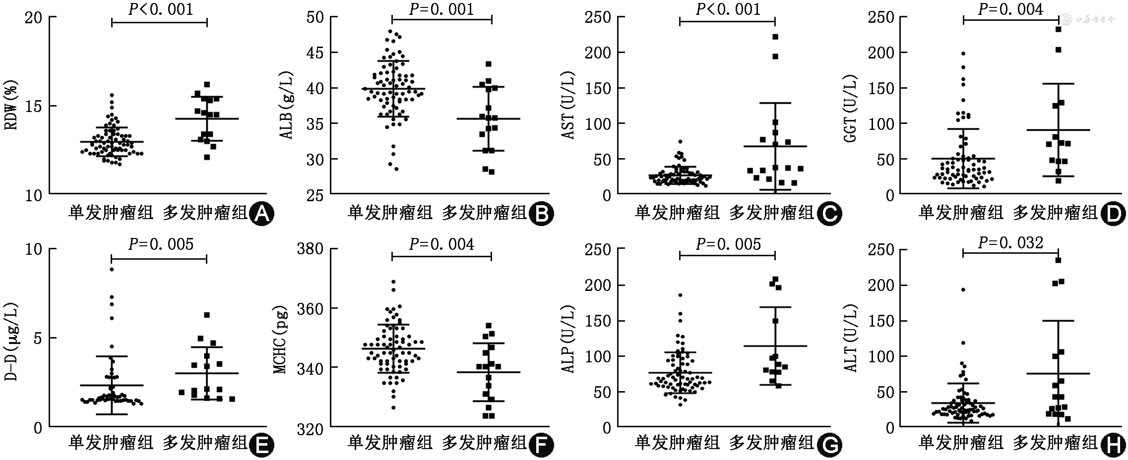 2. 单发与多发肿瘤患者各检测指标水平的比较:与单发肿瘤患者相比,多发肿瘤患者的RDW、D-Dimer、ALT、AST、ALP和GGT表达升高,而MCHC和ALB表达下降(均P<0.05,图1)。