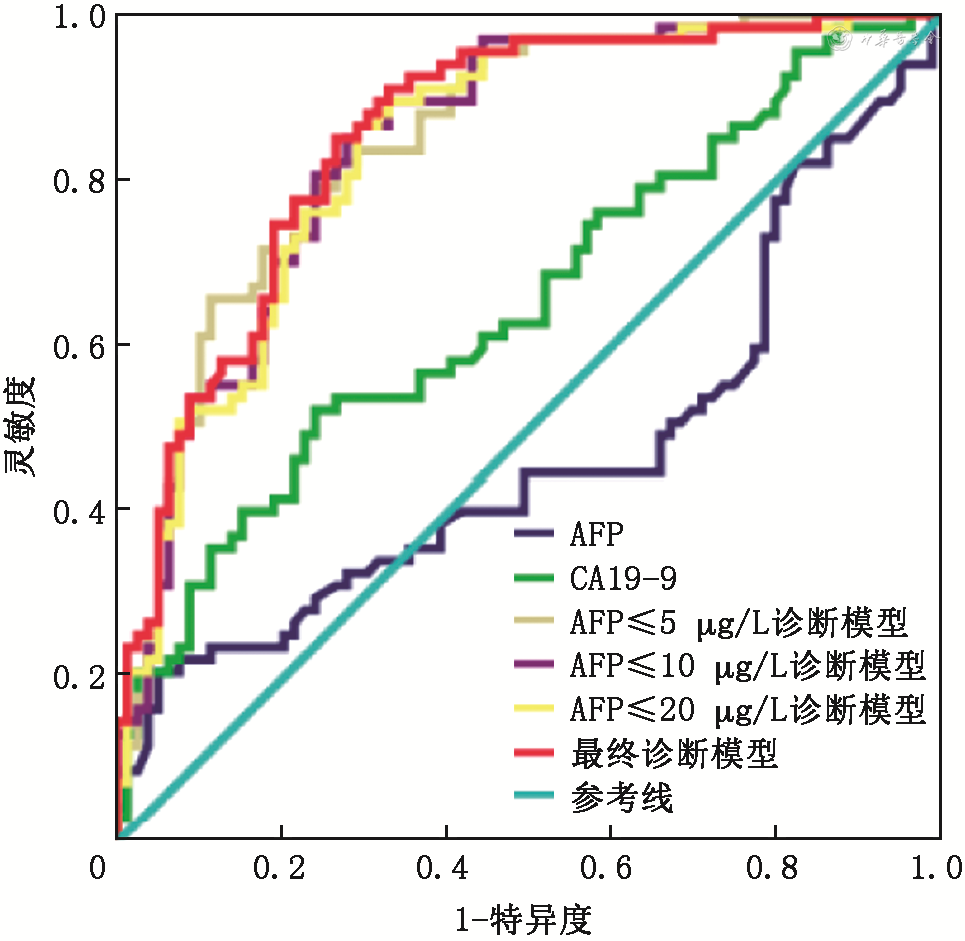 AFP的诊断效能并不能满足临床实际需求[15]。本研究分析结果也显示AFP对AFP-NHCC的诊断效能较低;同属于消化道肿瘤标志物的CA19-9的诊断效能也较低。本研究将AFP取为不同的值来分组分别建模后,得到在AFP不同低表达水平下,区分AFP-NHCC和其他肝部疾病的诊断模型及诊断效能。结果发现,AFP不同低水平时模型纳入的指标略有差异,但是灵敏度和特异度均较AFP和CA19-9有较大提升。