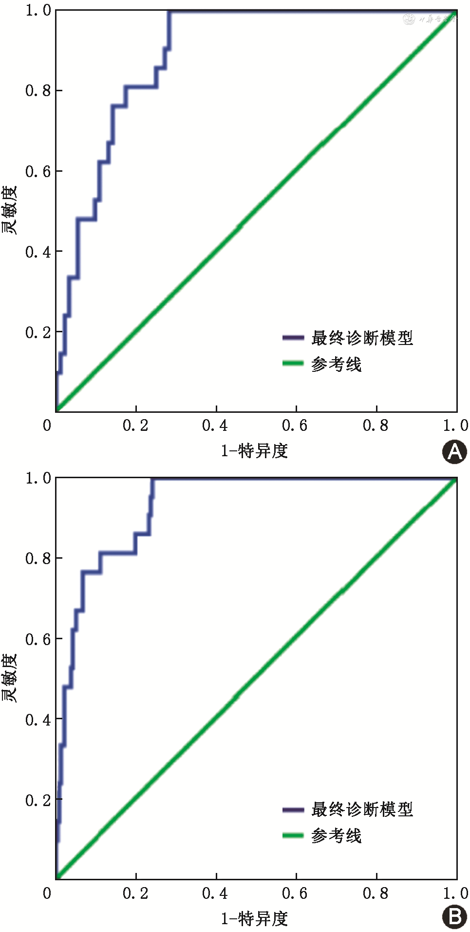 应用SPSS 22.0软件进行统计学分析。偏态分布数据用M(Q1,Q3)表示,组间比较采用Mann-Whitney U检验。计数资料采用频数及百分比表示,组间比较采用χ²检验。采用Spearman相关分析方法对临床指标与肿瘤特征的相关性进行分析。采用logistic 回归分析进行建模,筛选变量采用条件参数估计似然比检验。采用受试者工作特征(receiver operating characteristic curve,ROC)曲线对不同模型的诊断效能进行灵敏度及特异度分析,采用曲线下面积(area under the curve,AUC)评估不同模型的诊断效能。双侧检验,检验水准α=0.05。