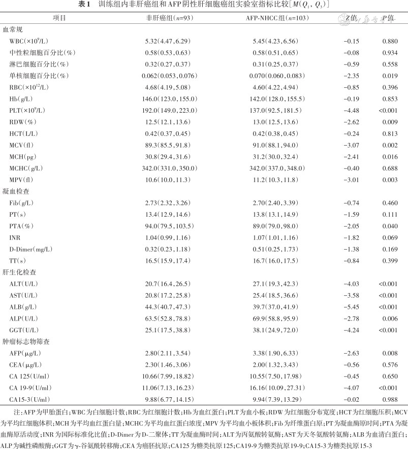 训练组内非肝癌组和AFP阴性肝细胞癌组实验室指标比较[M(Q1,Q3)]