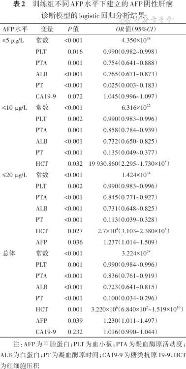 训练组不同AFP水平下建立的AFP阴性肝癌诊断模型的logistic回归分析结果