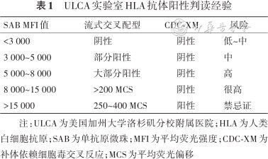 注:ULCA为美国加州大学洛杉矶分校附属医院;HLA为人类白细胞抗原;SAB为单抗原微珠;MFI为平均荧光强度;CDC-XM为补体依赖细胞毒交叉反应;MCS为平均荧光偏移