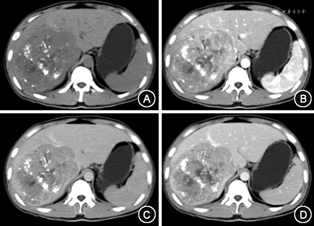 1. 临床资料:30例[男28例,女2例,平均年龄50.4(31~72)岁]cHCC-CC患者中23例(23/30,76.7%)有乙型肝炎病史,伴肝硬化21例(21/30,70.0%),1例(1/30,3.3%)伴肝吸虫病;血清AFP增高22例(22/30,73.3%);肿瘤表现为肝内单发结节17例,多发结节13例。其中18例临床症状为上腹胀痛不适,伴尿黄、黄疸及消瘦等,12例因体检发现肝内结节。13例术前行肝动脉栓塞化疗。