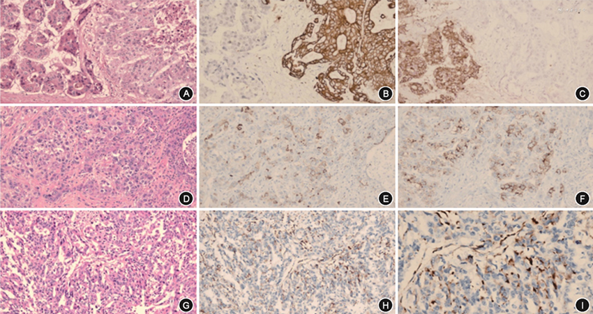 3. 病理检查:(1)大体检查:送检部分或全切肝组织,肝表面呈弥漫结节状,切面可见肝内单发、双发或多发结节,多发结节部分呈全肝内散在多发结节或表现为单个巨型结节周围多个小的卫星灶形成,切面灰白灰红,部分灰黄、灰绿伴出血坏死,以肝细胞癌成分为主者切面实性质中,以胆管细胞癌成分为主者实性质硬或质韧。(2)镜下观察:大多数典型的cHCC-CC包括肝细胞癌和胆管细胞癌两种成分,且两种成分紧密混合。肝细胞癌成分瘤细胞呈梁索状或假腺腔样型排列,梁索厚薄不一,被被覆单层内皮细胞的血窦样腔隙所分隔;部分呈假腺腔样型或腺泡状排列,腺管中央可见分泌的胆汁。瘤细胞类似于肝细胞,胞质丰富红染,核圆形、深染,核仁明显,可见瘤巨细胞及多核巨细胞,并可见Mallory透明小体及核内包涵体结构;胆管细胞癌呈腺管状、筛孔状或乳头状结构,瘤细胞为单层立方或高柱状上皮,部分呈假复层或乳头状排列,胞质丰富淡红染(较肝细胞癌胞质染色淡),核大、卵圆形,染色较肝细胞癌核淡,核仁不明显,但多形性明显,腺腔内见淡红染的黏液而非胆汁;癌灶周围富含反应性纤维间质。30例中有25例呈胆管细胞成分及肝细胞成分分别单独存在,但互相接近(即碰撞型肿瘤);其余5例表现为中间细胞癌,形态介于肝细胞癌和胆管细胞癌之间的中间细胞,细胞体积小,胞质少、略嗜碱性的细胞,核深染,可呈小梁状或腺管状排列(图2)。21例肿瘤周围肝组织伴肝硬化,呈大小结节混合型肝硬化改变,1例可见肝吸虫虫体。7例门脉内见癌栓,癌栓成分多为胆管细胞癌成分。