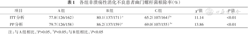 各组非溃疡性消化不良患者幽门螺杆菌根除率(%)