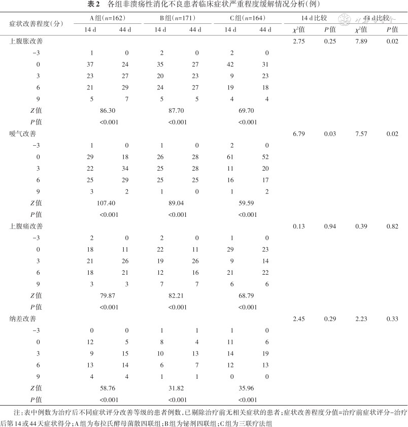 4. 症状及不良反应评估:症状评分按照腹胀、嗳气、上腹痛、纳差4项临床症状严重程度由轻至重赋值0、3、6、9分4个等级。于治疗前、治疗后14 d、治疗后44 d对患者进行随访,填写病例报告表。详细记录患者的症状及其改善情况、服药情况、不良反应等信息。计算症状改善程度分值(治疗前症状评分-治疗后第14天或第44天症状评分),统计不同症状改善分值受试者人数。