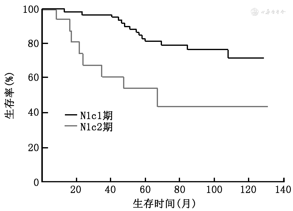 注:N1c期为淋巴结总数或阴性淋巴结数≥13枚,69例;N1c2期为淋巴结总数或阴性淋巴结数<13枚,16例