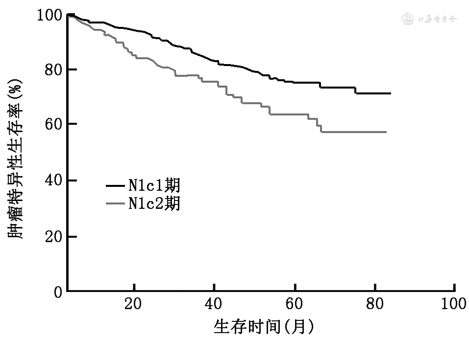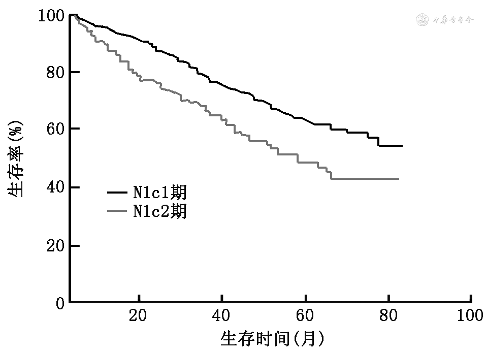 注:N1c1期为淋巴结总数或阴性淋巴结数≥13枚,837例;N1c2期为淋巴结总数或阴性淋巴结数<13枚,243例