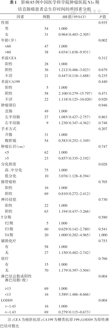 影响85例中国医学科学院肿瘤医院N1c期结直肠癌患者总生存时间的单因素分析