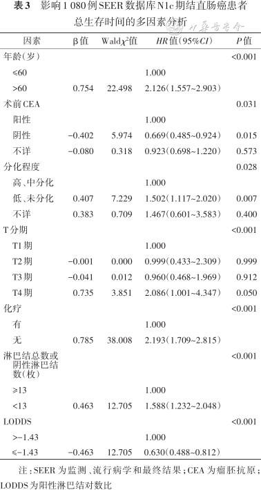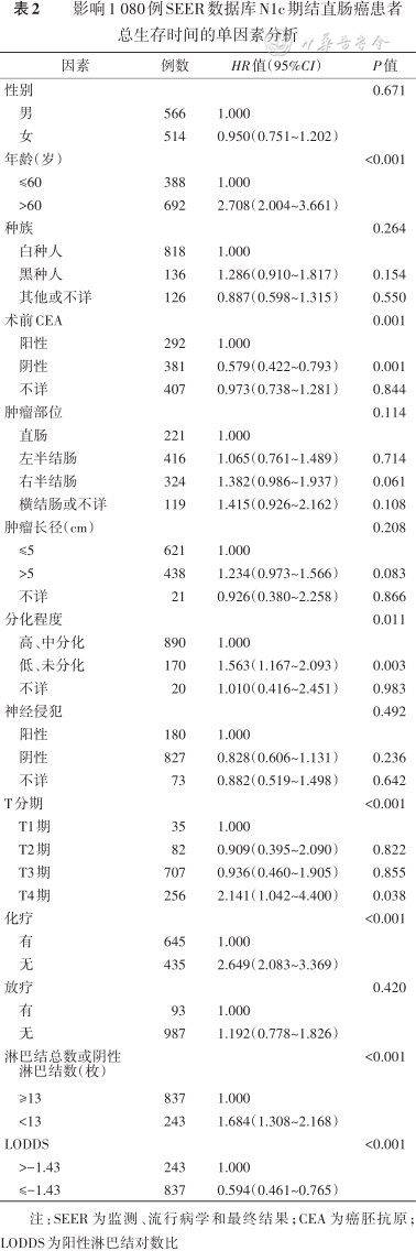 影响1 080例SEER数据库N1c期结直肠癌患者总生存时间的多因素分析
