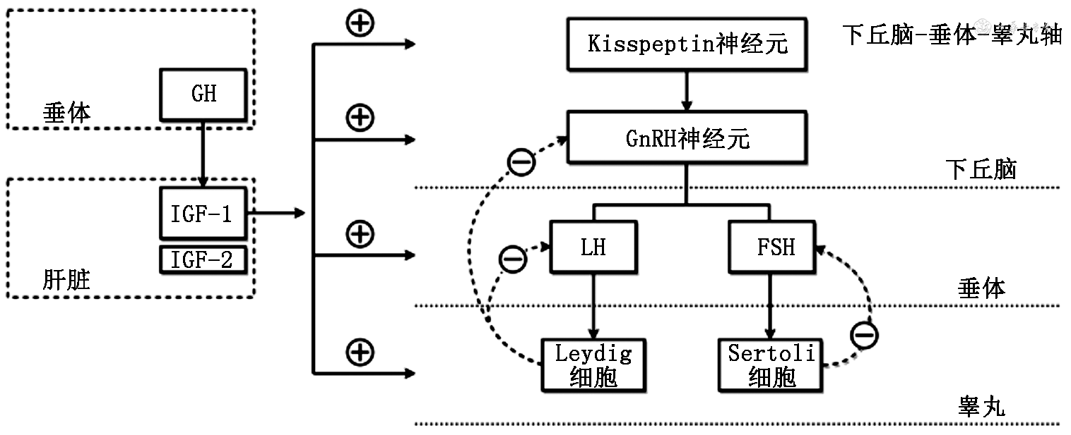 临床数据表明,IGFs不仅参与骨骼的纵向生长,还参与调控HPT轴,影响睾丸下降、青春期启动以及生殖器功能成熟。在出生后微小青春期阶段,血清IGF-1浓度、睾丸间质细胞和支持细胞功能共同决定了出生后睾丸的位置能否下降到阴囊内。此时,血清IGF-1浓度与睾丸到耻骨的距离(TDP)呈独立正相关[6]。也就是说,IGF-1浓度越高,睾丸下降越完全。总体上,在儿童和青春期,IGF-1水平呈线性升高。在达到青春期最大生长速度后,血清IGF-1水平还将持续升高约2年,并在成年期缓慢下降。在青春发育前期,IGF-1通过促进促性腺激素释放激素(GnRH)神经元成熟以及增加GnRH脉冲分泌,参与诱导青春期启动。在青春过渡期,即在生长速度达峰后,循环IGF-1水平仍显著升高,表明IGFs在这一阶段的重要靶器官可能是生殖系统,而非骨骼。在此阶段,IGF-1的明显增加诱导“休眠”生殖器官恢复生长和发育[7]。在成人阶段,IGFs的水平与精子数量、质量和活力存在一定相关性。