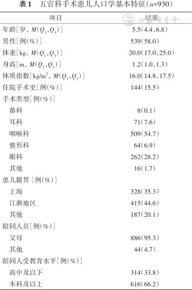 本研究共回顾分析了1 006例患儿的临床资料,其中68例患儿缺失MAS评分,5例患儿偏离既定的程序性镇静方案,3例患儿年龄不符合要求,最终930例患儿纳入分析,年龄[M(Q1,Q3)]为5.5(4.4,6.8)岁。男性患儿占58.0%(539/930),既往有住院病史患儿占15.5%(144/930)。手术类型中,咽喉科(如扁桃体、腺样体手术)和眼科(如斜视、倒睫手术等)居多,分别占54.7%(509/930)和28.2%(262/930)。患儿所在地以上海及江浙地区为主,分别占35.3%(328/930)和44.6%(415/930)。陪同人员是患儿父母的比例为95.3%(886/930);患儿父母受教育水平多为本科及以上,占66.2%(616/930)。930例五官科手术患儿人口学基本特征详见表1。
