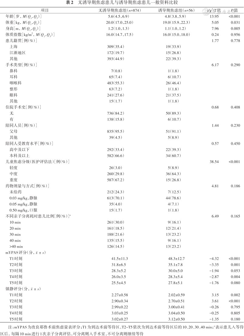 | 项目 | 无诱导期焦虑组(n=874) | 诱导期焦虑组(n=56) | t/χ2/Z值 | P值 |